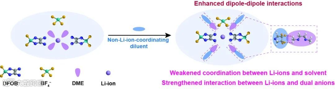 图1. 在二元盐电解液中,通过增强Li离子配位溶剂与非Li离子配位稀释剂之间的偶极-偶极相互作用调控的Li离子溶剂化结构示意图。