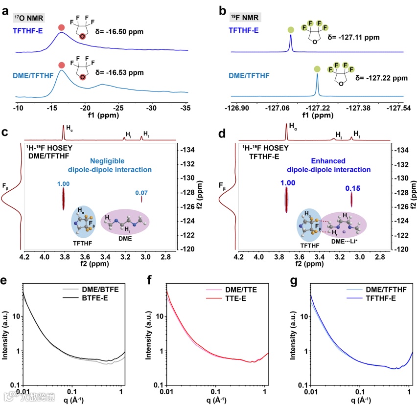 图3.增强的偶极-偶极相互作用及电解液的溶剂化纳米结构。a) ¹⁷O和b) ¹⁹F NMR分析TFTHF在DME/TFTHF混合物和TFTHF-E电解液中的配位行为;c) DME/TFTHF混合物中溶剂DME与稀释剂TFTHF之间的偶极-偶极相互作用的2D ¹H-¹⁹F HOESY分析;d) TFTHF-E电解液中溶剂DME与稀释剂TFTHF之间的偶极-偶极相互作用的2D ¹H-¹⁹F HOESY分析;e) DME/BTFE、f) DME/TTE、g) DME/TFTHF混合物在加入双锂盐前后的SAXS分析。