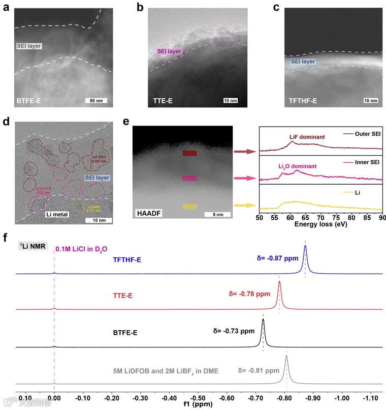 图6.SEI纳米结构及增强的锂离子-阴离子相互作用。a) BTFE-E、b) TTE-E和c) TFTHF-E电解液中形成的SEI的冷冻透射电子显微镜(cryo-TEM)图像;d) TFTHF-E电解液中形成的SEI的高分辨TEM图像;e) HAADF-TEM图像及Li K边EELS谱图;f) 二元盐电解液中锂离子溶剂化结构的⁷Li NMR。