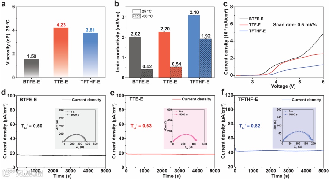 图4. 二元盐电解液的物理化学和电化学性质。a) BTFE-E、TTE-E和TFTHF-E电解液在25°C时的黏度;b) BTFE-E、TTE-E和TFTHF-E电解液在25°C和-30°C时的离子电导率;c) 在Li||Al电池中,BTFE-E、TTE-E和TFTHF-E电解液的线性扫描伏安(LSV)曲线;d) BTFE-E、e) TTE-E、f) TFTHF-E电解液的锂离子迁移数测量,插图为极化前后的EIS谱图。