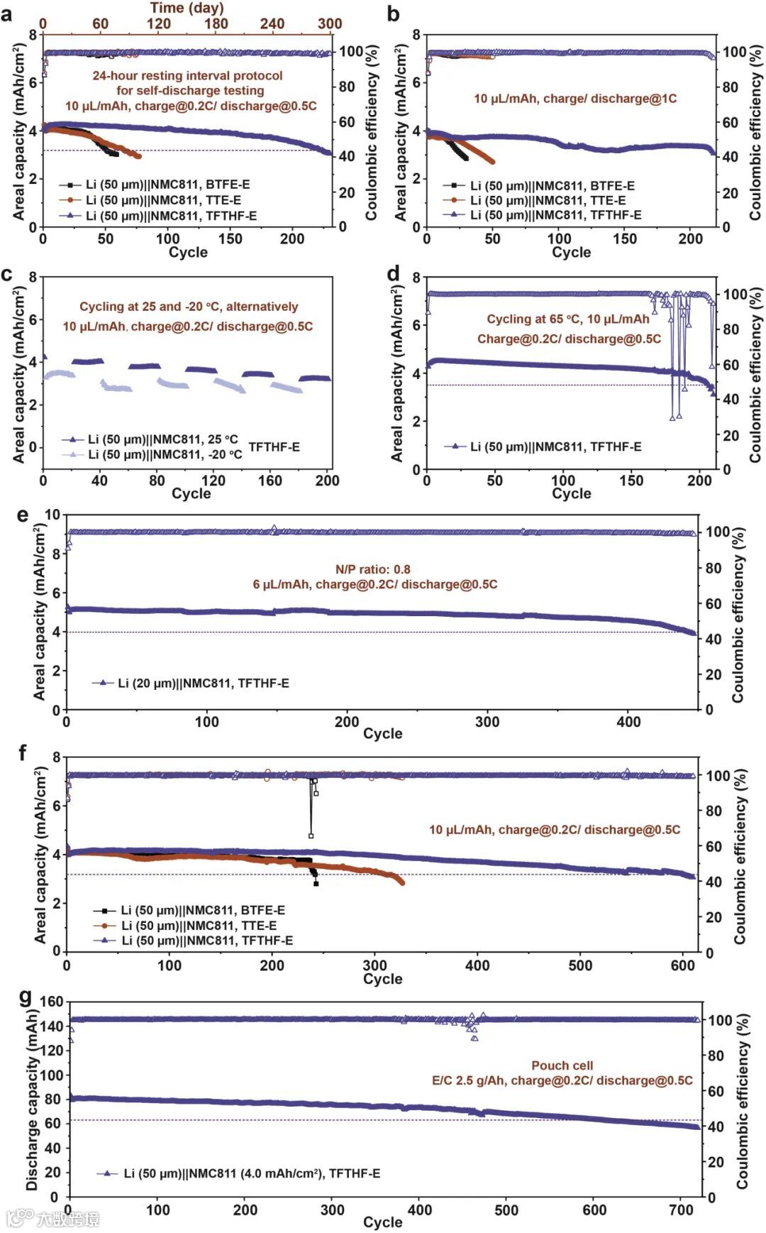 在揭示了增强的偶极-偶极相互作用对电解液和SEI层化学性质的影响后,我们进一步进行了LMBs的电化学评估,采用了BTFE-E、TTE-E和TFTHF-E的二元盐电解液。为评估这些电解液在实际操作中稳定锂金属负极的可靠性,我们采用了充放电周期间隔24小时的休息间隔进行自放电评估(图7a)。TFTHF-E电解液在292天内经过225个周期后,Li||NMC811全电池保持80%容量,而使用BTFE-E和TTE-E电解液的电池在51和65个周期后仅保持80%容量,显示出TFTHF-E电解液能够显著减缓锂金属腐蚀,稳定锂金属负极,具有提高LMBs日历寿命的潜力。