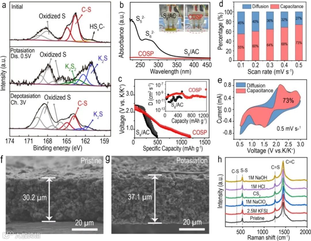 图6.(a)COSP在不同充放电状态下的非原位高分辨率S 2p XPS光谱;(b)在放电6小时后电解液的紫外-可见光谱(插图为电池槽的照片);(c)放电过程中的GITT曲线及扩散系数Dk值;(d)钾离子储存过程中的电容和扩散容量贡献;(e)扫描速率为0.5 mV/s时的电容容量贡献;(f)COSP电极钾化前的SEM图像;(g)COSP电极在0.06 A g–1条件下钾化后的SEM图像;(h)COSP在有机电解液、碱性溶液、酸性溶液和二硫化碳(CS2)溶剂中处理5天后的拉曼光谱。