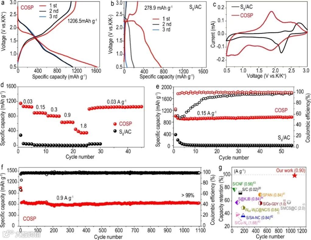 将COSP作为正极材料组装成电池时,在Na-S和K-S电池中表现出优异的电化学性能。电化学研究表明,该COSP正极比传统的S8正极具有更优异的活性和反应动力学。特别地,作为挑战性极大的K-S电池的正极时,COSP正极可发挥高的比容量(1206.5 mAh g⁻¹)和优异的循环稳定性,在0.9A g-1条件下1100次循环后容量保持率接近100%。