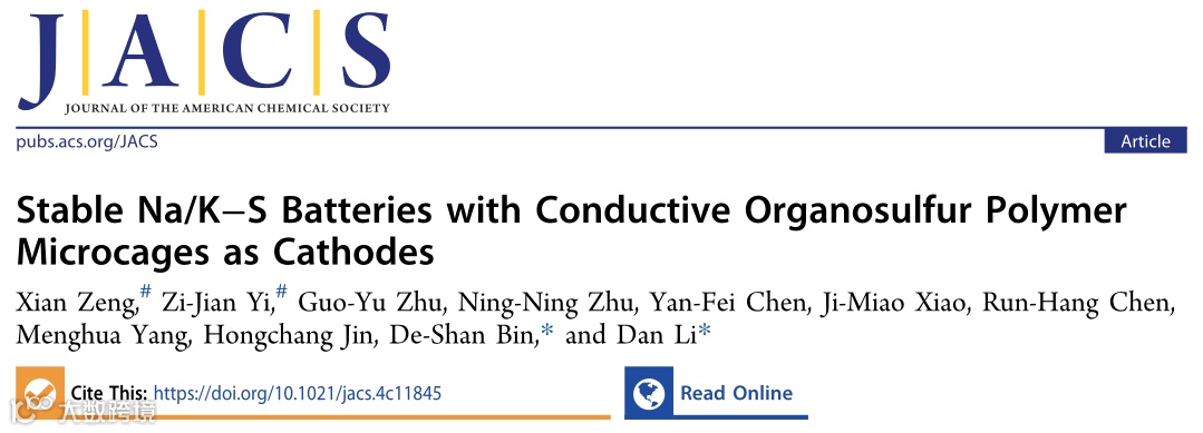 基于此,暨南大学宾德善/李丹团队在国际知名期刊J. Am. Chem. Soc.上发表了题为“Stable Na/K–S Batteries with Conductive Organosulfur Polymer Microcages as Cathodes”的研究论文。该论文以具有丰富的离域C=C和C=S基团结构的导电有机硫聚合物微笼(COSP)作为高比容量、长寿命钠硫和钾硫电池正极材料。该硫基正极材料是通过将短链硫共价键合到导电聚合物基质中获得的,能有效抑制可溶性多硫化物的形成。借助微笼内部的空腔有效缓冲电化学反应过程中产生的体积形变,展现出优异的储钠、储钾反应动力学,作为的K-S电池的正极时,COSP正极可发挥高的比容量(1206.5 mAh g⁻¹)和优异的循环稳定性,在0.9A g-1条件下1100次循环后容量保持率接近100%。