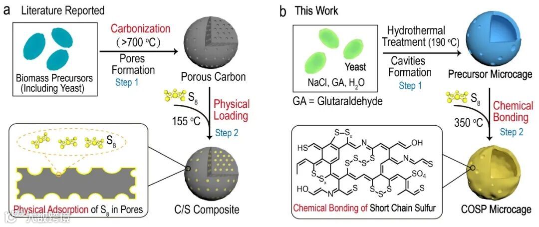 生物质来源丰富、化学组分丰富,作为碳前驱体已经被广泛报道。已有研究通常是通过高温(如>700 ℃)热解生物质前驱体获得多孔碳(如示意图1a),然后通过熔融法将单质硫与多孔碳进行孔限域复合获得S8/C正极材料,单质硫和碳基底是以物理吸附或限域的方式复合;不同于已报道的碳硫复合物,该研究通过水热反应对酵母菌进行选择性刻蚀获得微米笼生物质中间体,然后将其与单质硫进行控制热处理(如350 ℃),使得两种前驱体在受热环境中反应重构,形成导电有机硫聚合物微米笼(如示意图1b),而不是转变成碳材料;硫组分以短链硫的形式通过化学键合均匀分散在聚合物基质中。