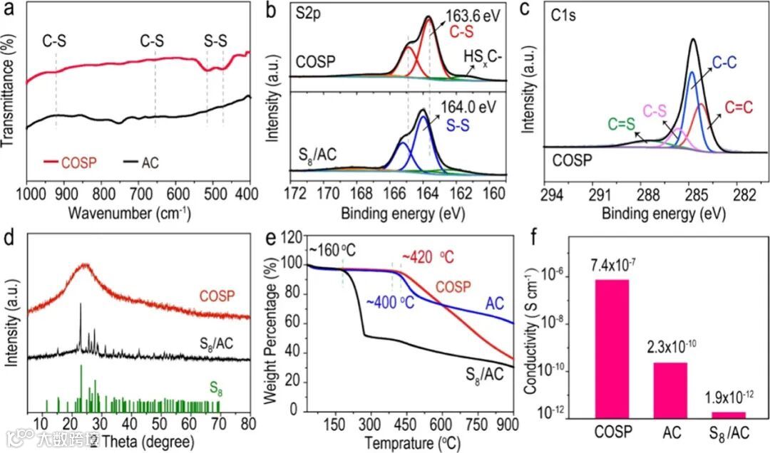图3. (a) FTIR图谱;(b) COSP的高分辨率S2p XPS光谱;(c) COSP的高分辨率C1s XPS光谱;(d) XRD图谱;(e) 热重分析;(f)电子导电性的比较。
