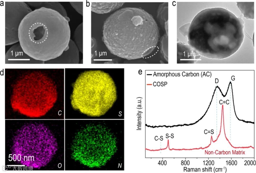 图2. COSP材料的结构表征。(a)水热处理后得到的酵母衍生微笼SEM图像;(b)COSP的SEM图像;(c)COSP的TEM图像;(d)COSP的元素分布图;(e)拉曼光谱。