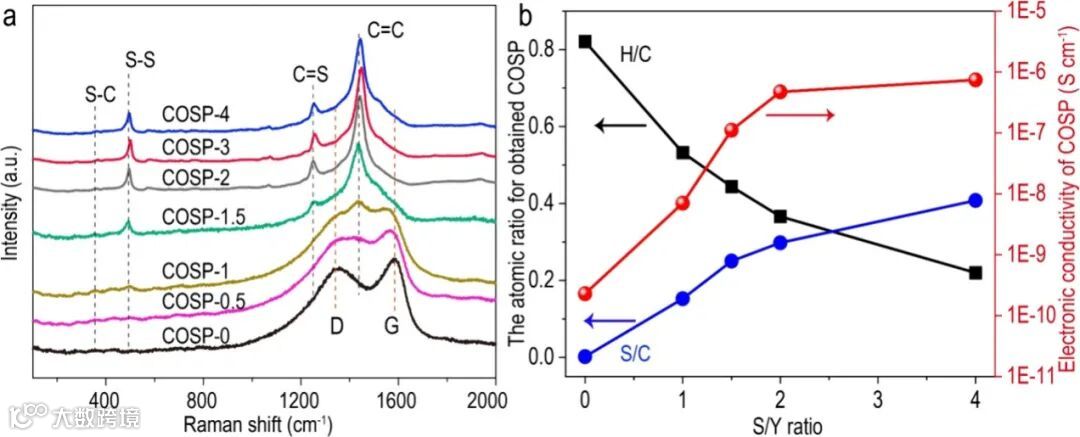 图4. (a)拉曼光谱;(b)不同S/Y质量比COSP-X样品的H/C、S/C原子和电子导电性的变化曲线。