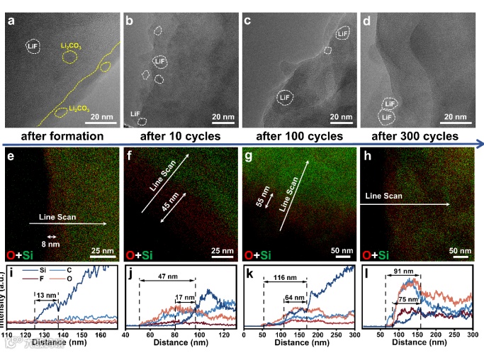 图 4:不同循环周数的硅颗粒上SEI的纳米结构演变。化成后、循环10、100、300周后的(a)-(d) 高分辨cryo-TEM图像,(e)-(h) O和Si元素的分布,以及 (i)-(l) 硅颗粒的线扫描曲线。