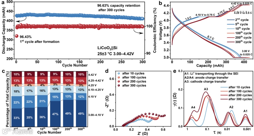 图 1:450 mAh LiCoO2||Si软包电池的电化学性能。(a) 化成后电池的循环性能,(b) 第2、5、10、100、200和300周的电压曲线,以及 (c) 对应周数各电压区间的充电容量贡献。(d) 循环10、100、200和300周后电池的电化学阻抗谱(EIS)以及 (e) 利用弛豫时间分布(DRT)分析得到的对应谱图。