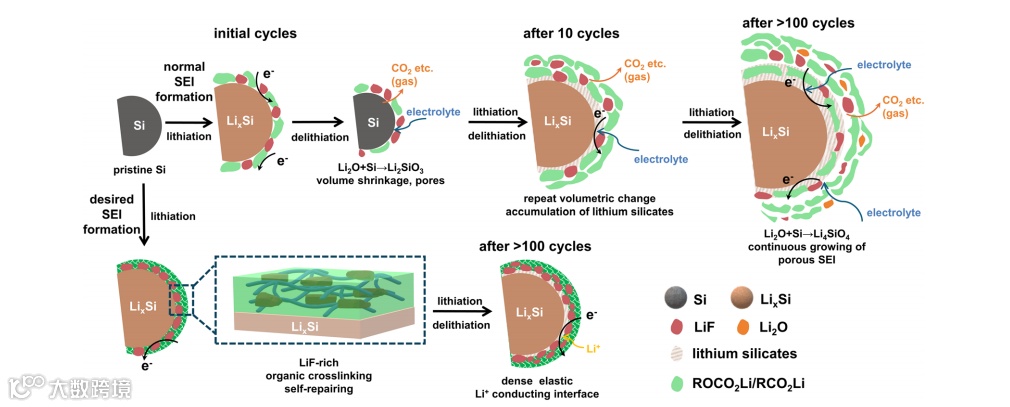 因此,需要构筑致密、弹性交联且具有锂离子传导能力的 SEI 膜来稳定硅负极界面。已有的研究报道主要强调了构建富无机组分的致密界面层的重要性,而忽略了构筑有机交联的界面的重要性;后者有助于减轻硅负极的体积效应,有助于提高硅界面的致密度和力学稳定性。