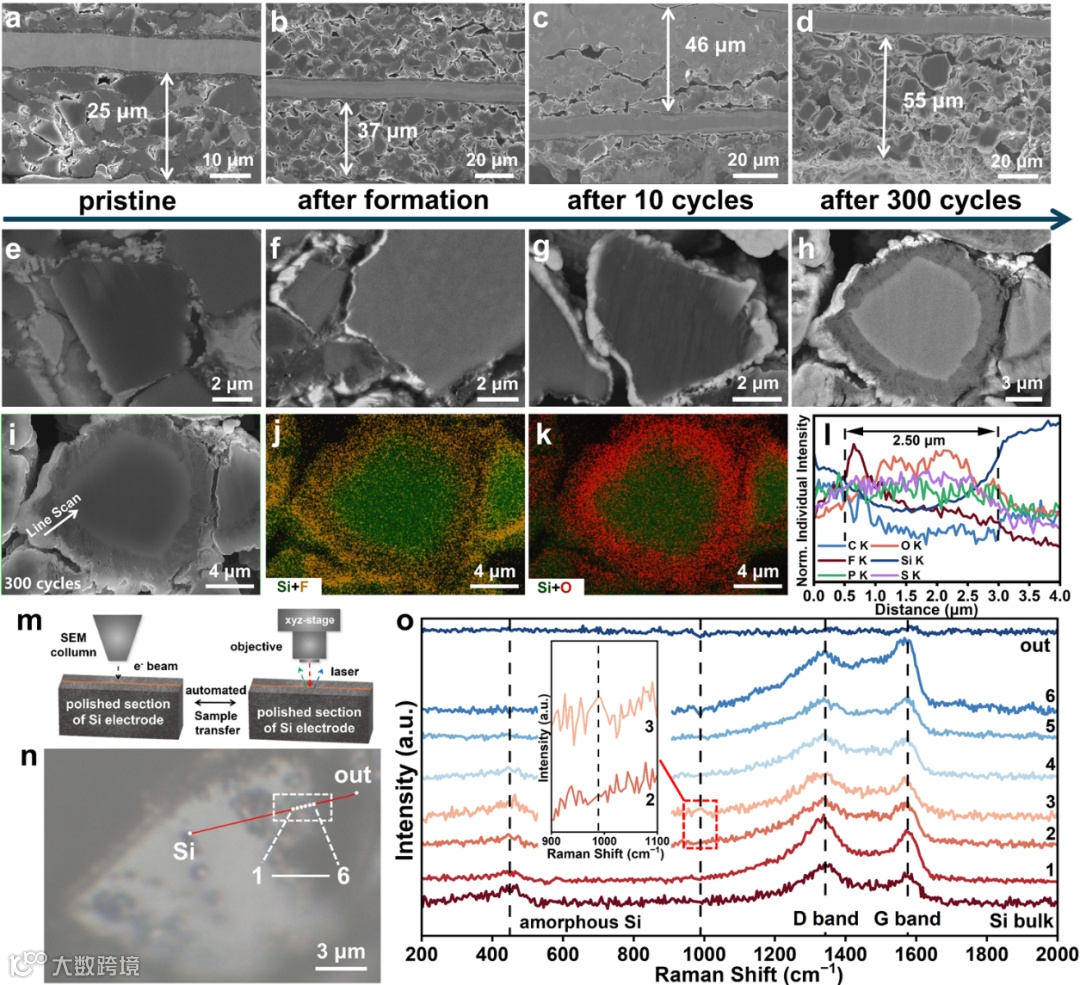 图 2:不同循环周数下硅负极的形貌变化。(a)-(d)原始硅极片、化成后、循环10、300周后硅极片的横截面图像,以及 (e)-(h) 对应的放大图像。(i)-(k) 通过X射线能量色散谱(EDS)得到的元素分布图和 (l) 线扫描曲线。(m) SEM-Raman分析的示意图。(n) 循环300周后单个硅颗粒截面的光学图像,以及 (o) 沿其表面获取的拉曼光谱,插图为对应谱线900到1100 cm-1的放大区域。