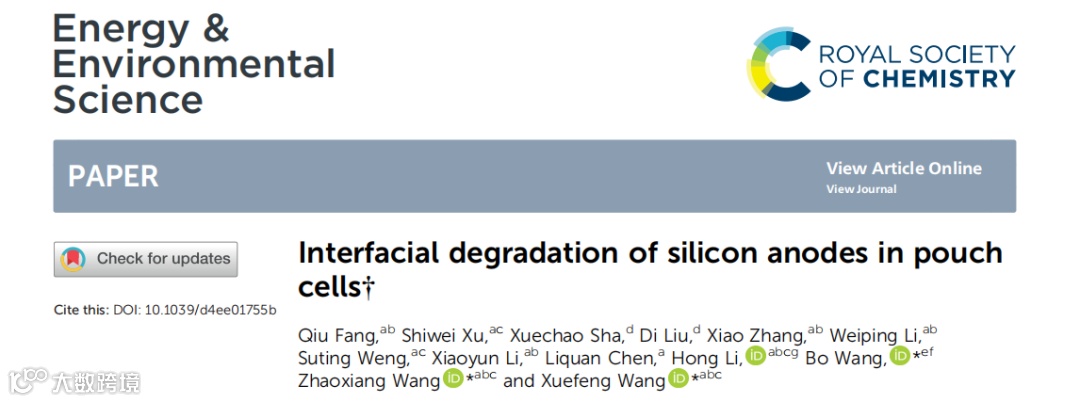 基于此,来自中国科学院物理研究所的王雪锋、王兆翔团队与哈尔滨工业大学的王博团队合作,在国际知名期刊Energy & Environmental Science 上发表题为“Interfacial degradation of silicon anodes in pouch cells”的文章。该文章聚焦研究了软包电池中的硅负极的界面演变行为,结果表明,硅颗粒表面逐渐被电解液腐蚀,形成了富含烷基酯锂、锂硅酸盐,厚度达微米级并且多孔的SEI。根据对SEI的成分与结构演变的表征分析,该文提出了“由内向外”的SEI生长机制。并提出了构筑致密、弹性交联且具有锂离子传导能力的 SEI 膜以稳定硅负极界面。