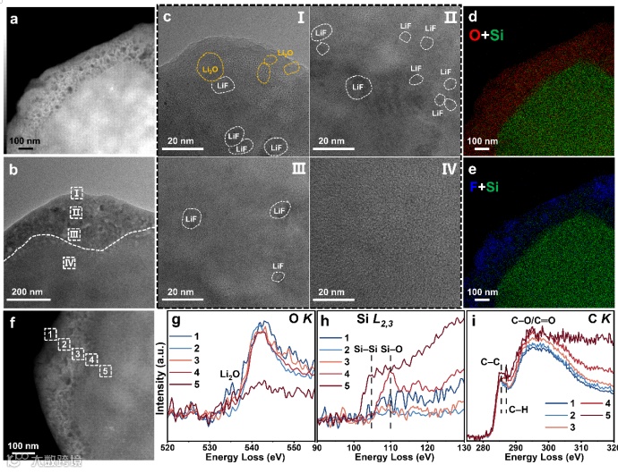 图 5:循环300周后硅颗粒上SEI的剖面。(a) 通过cryo-FIB提取的界面层薄片的STEM暗场图像。(b) 界面层cryo-TEM图像及其从界面层到硅体相对应选取位置的HRTEM图像。(d) 和 (e) O(红色)、F(蓝色)和Si(绿色)的元素分布图。(f) STEM暗场图像及其对应的EELS谱采集位置,(g) 对应位置的O K边,(h) Si L2,3边,以及 (i) C K边谱图。