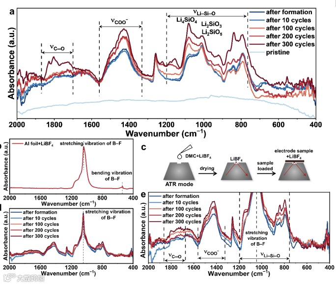 图 3:通过FTIR-ATR探测的不同循环周数的硅负极的SEI成分演变。(a) 不同循环周数的硅负极的FTIR-ATR光谱。(b) LiBF4的FTIR-ATR光谱。(c) 在FTIR-ATR测量中引入LiBF4外标物的示意图。(d)含LiBF4外标物的不同循环周数的硅负极FTIR-ATR谱图,以及(e) 对应的放大谱图。