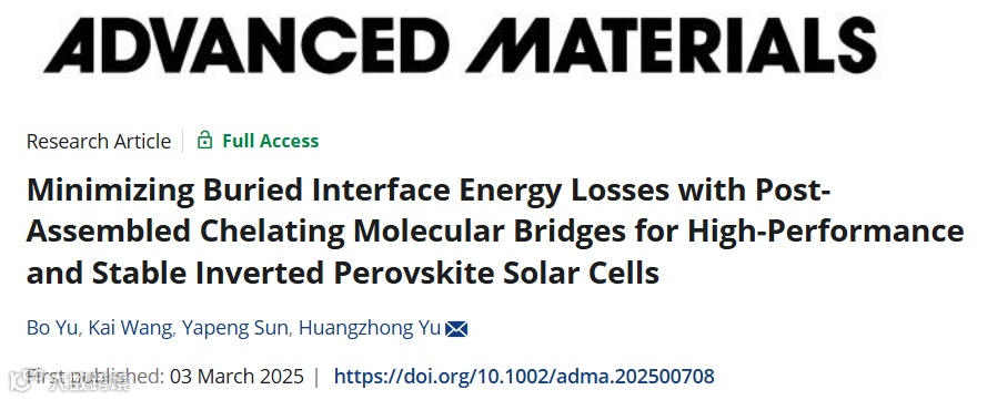 基于此,来自华南理工大学的於黄忠教授,在国际知名期刊Advanced Materials上发表题为“Minimizing Buried Interface Energy Losses with Post-Assembled Chelating Molecular Bridges for High-Performance and Stable Inverted Perovskite Solar Cells”的观点文章。该观点文章提出了一种后组装螯合分子桥的策略来改善倒置PSCs中钙钛矿/SAMs界面,以最小化界面能量损失。