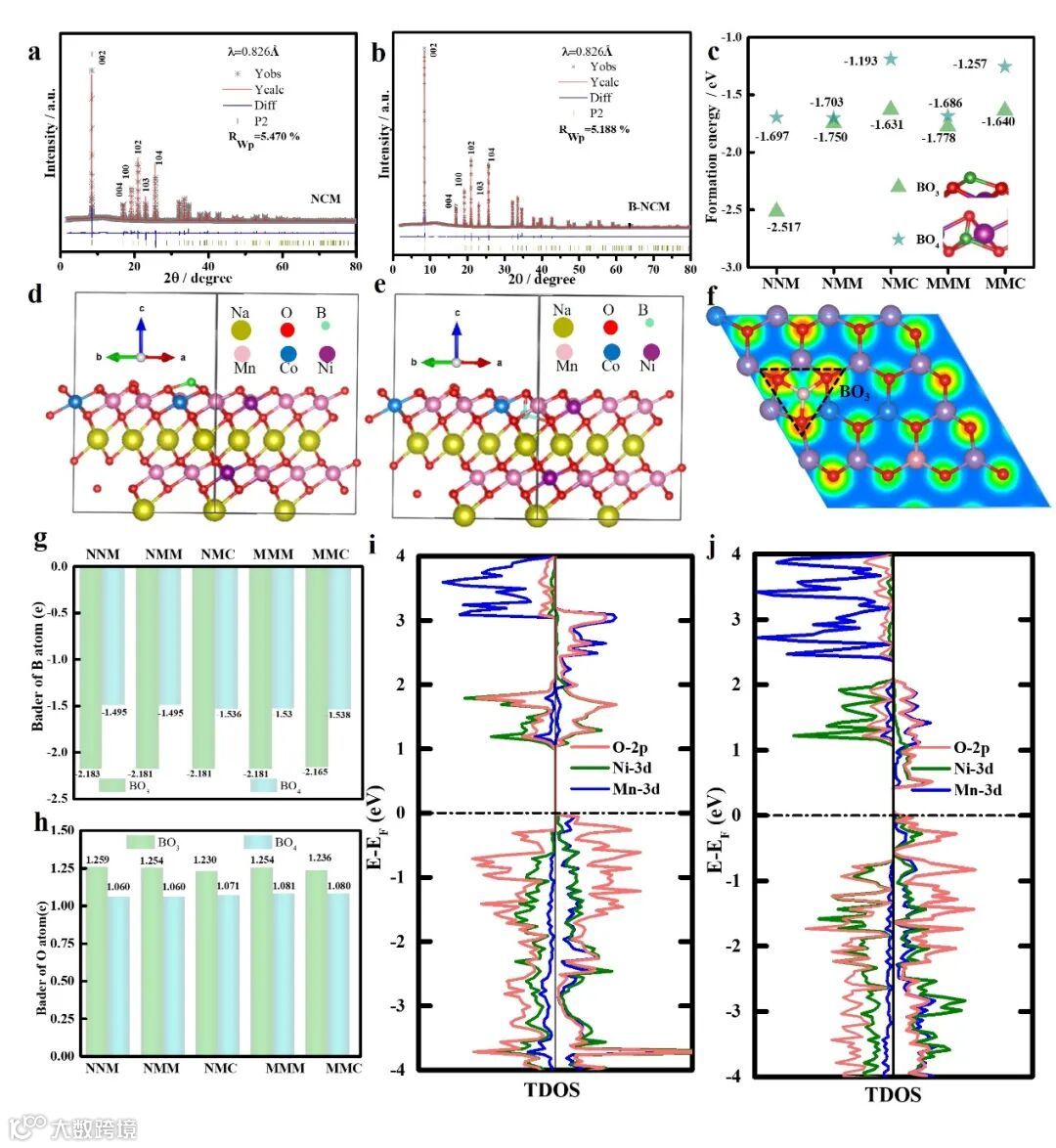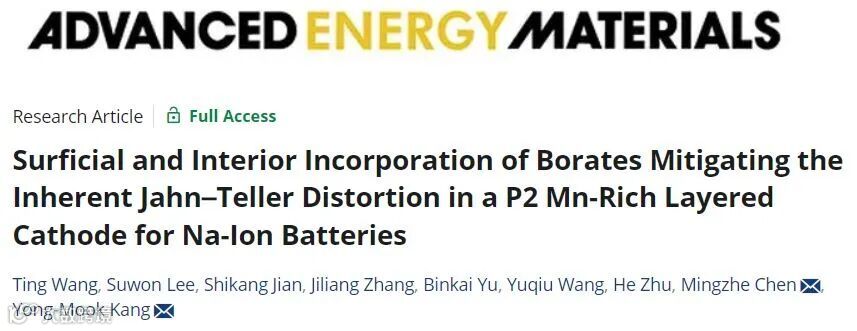 基于此,来自南京理工大学的陈明哲教授与高丽大学的Yong-Mook Kang教授合作,在国际知名期刊Advanced Energy Materials上发表题为“Surficial and Interior Incorporation of Borates Mitigating the Inherent Jahn–Teller Distortion in a P2 Mn-Rich Layered Cathode for Na-Ion Batteries”的研究文章。该观点文章通过系统的实验和理论计算,展示了硼酸盐掺杂在改善富锰层状正极材料性能方面的有效性,特别是在抑制Jahn-Teller畸变和提高结构稳定性方面。