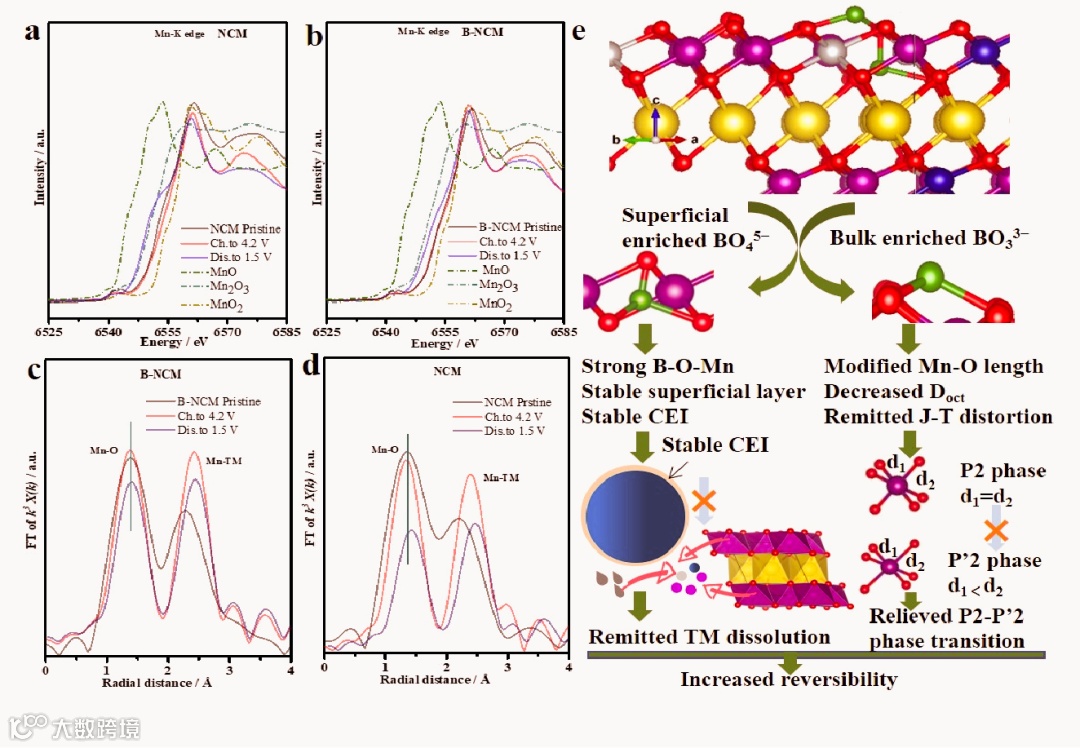 图1. 表面BO45-和体相BO33-掺杂有效提升P2富锰基正极材料可逆性的机理示意图