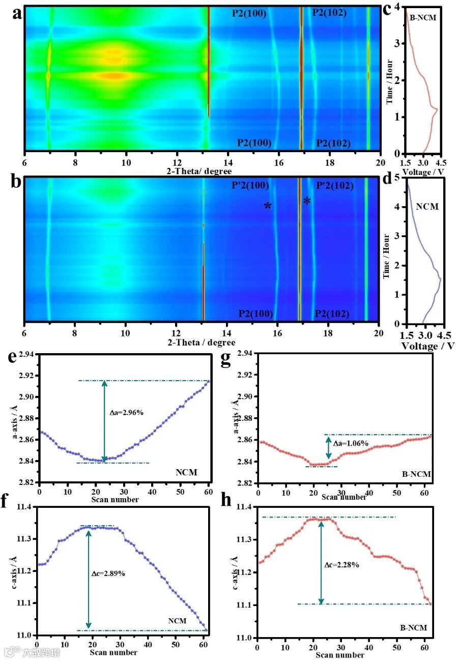 动力学研究通过CV、GITT和EIS分析表明,B-NCM具有更快的钠离子扩散速率和较低的极化。由GITT计算分析可知,B-NCM的DNa⁺扩散系数为(10-12–10-13cm²/s)高于NCM(10-12–10-14 cm²/s),归因于扩大的层间距和降低了的极化。原位XRD分析显示B-NCM在充放电过程中晶格参数变化较小,说明充放电过程中结构稳定性更好。