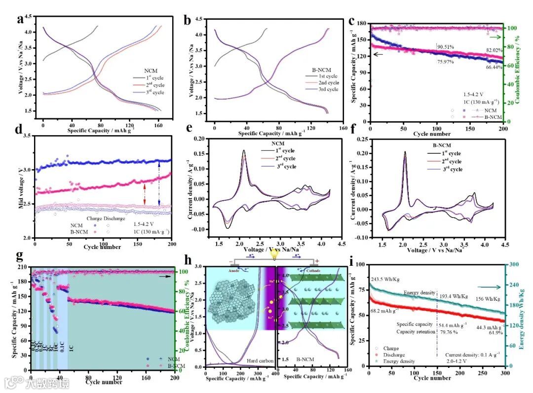 硼酸盐掺杂的样品(B-NCM) c轴扩展 (11.2393 Å → 11.2372 Å), 促进了Na⁺扩散;a/b轴收缩(2.8692 Å → 2.8686 Å),抑制层间滑移。电子结构方面,硼掺杂可有效降低能带隙,提升电子导电性(Ni的局域态密度贡献显著)。因此,硼酸盐掺杂后的材料相较于未掺杂的材料(NCM)在电化学性能方面有明显提升。首先显著的是循环稳定性的提升,B-NCM在经历了200次循环后容量保持率82.02% (NCM为66.4%)。其次倍率性能也提升明显,在10C大电流密度下,B-NCM的比容量102.9 mAh/g (NCM为79.5 mAh/g)。最终,用B-NCM和硬碳所组装的全电池也显示较好的应用前景,其能量密度可达243.5 Wh/kg(基于正负极总质量)。