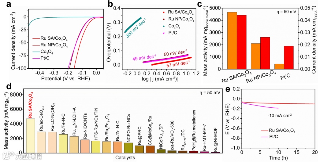 Ru SA/Co3O4催化剂在碱性介质中表现出优异的 HER 催化性能,在50 mV 下其质量活性分别是商业Pt/C和Ru NP/Co3O4的11倍和2倍,并且优于迄今为止报道的大多数 Ru 基碱性HER电催化剂。