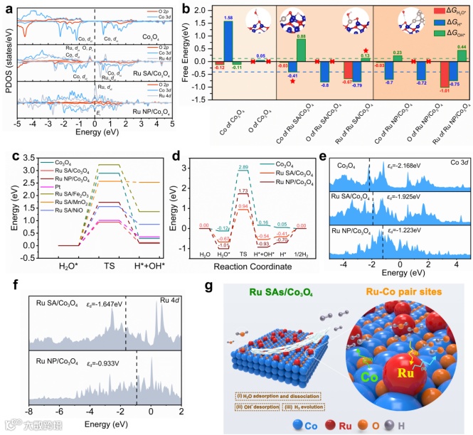 我们通过密度泛函理论研究,进一步揭示了Ru SA/Co3O4催化剂表面Ru 和 Co 双活性位点之间在HER中的协同作用,即Ru 位点能够实现有效的水吸附/解离和 OH− 的解吸,而 Co 位点可以有效地促进 H* 的吸附和 H2 的析出。