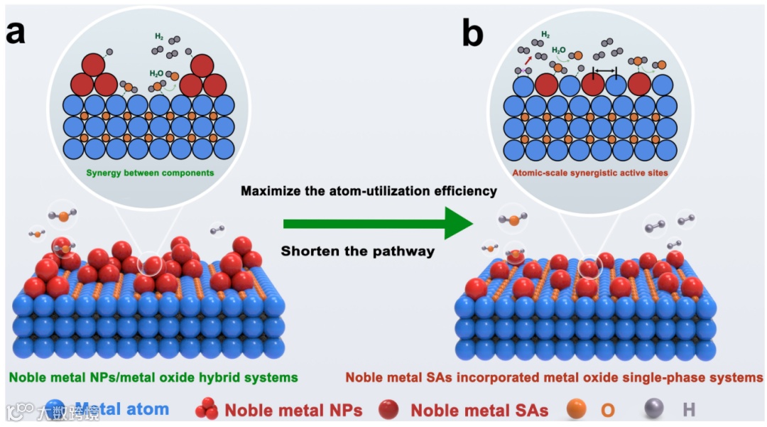 图1. 两种不同类型的协同电催化剂上催化碱性HER示意图。(a) 传统的贵金属纳米颗粒/金属(氢)氧化物复合电催化剂体系。(b) 单原子贵金属掺杂的金属氧化物单相电催化剂体系。