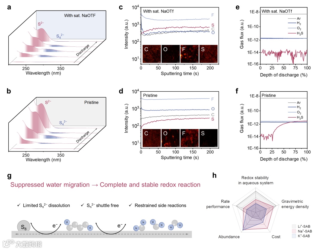 要点:本研究通过多种分析手段深入研究了碱金属离子硫水系电池(SABs)中硫的溶解、穿梭效应及其对电池性能的影响。紫外-可见光谱(UV-vis)被用于监测溶解的S²⁻物种。结果显示,使用饱和NaOTf电解液时,Na₂S的溶解比例在完全放电时仅为49.8%,显著低于原始电解液(几乎完全溶解),表明抑制水迁移能够限制硫物质溶解度,从而显著提高了硫电极的循环稳定性。原位UV-vis实验进一步揭示了放电过程中多硫化物的穿梭效应,溶解的S²⁻因浓度梯度和电位差在阳极液中积累,导致原始电解液中的电池库仑效率(CE)显著下降。时间飞行二次离子质谱(TOF-SIMS)分析表明,饱和NaOTf体系中硫电极的硫含量显著高于原始电解液体系,表明其活性硫物种损失极小。原位差分电化学质谱(DEMS)检测到原始电解液在放电过程中释放出H₂S气体,这是由于溶解的硫物种在低电位下发生不可逆的热力学转化。相比之下,饱和NaOTf体系中未检测到明显的气体释放,表明其热力学稳定性更高。拉曼光谱进一步确认了硫代硫酸盐的形成,这种热力学转化会损害SABs的寿命。此外,研究还对Li⁺、Na⁺和K⁺-SAB体系进行了综合评估,从氧化还原稳定性、比能量密度、倍率性能、成本和资源丰富度等多方面进行比较。结果表明,K⁺-SAB在各方面表现均衡,Li⁺-SAB具有优异的倍率性能和氧化还原稳定性,而Na⁺-SAB则因其成本效益而更适合大规模储能技术。这些发现表明,“碱金属离子-贫H₂O配位”策略为设计高性能、稳定的硫水系电池提供了新的方向。