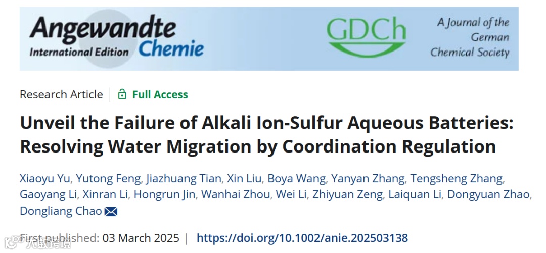 2025年03月4日,Angew Chemie在线发表了复旦大学在水系电池领域的最新研究成果:Unveil the Failure of Alkali Ion-Sulfur Aqueous Batteries: Resolving Water Migration by Coordination Regulation。论文第一作者为复旦大学硕士生虞小玉和博士后冯宇通,通讯作者为复旦大学晁栋梁教授。