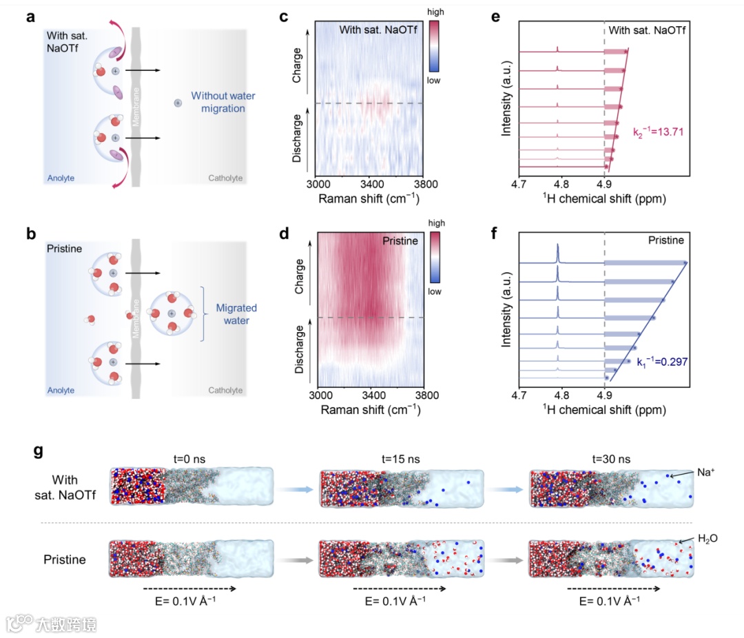 图3水迁移抑制效果。(a,b)水跨膜迁移的示意图。蓝色圆圈代表水合的 Na+。黑色箭头表示 Na+ 的移动方向;(c,d)硫阴极的原位拉曼光谱;(e,f)硫正极电解液的非原位 NMR;(g) 在 0.1 V Å−1 电场下 0、15 和 30 ns 的 MD 模拟快照。红色、白色和蓝色球体分别代表来自阳极物的 O、H 和 Na 原子