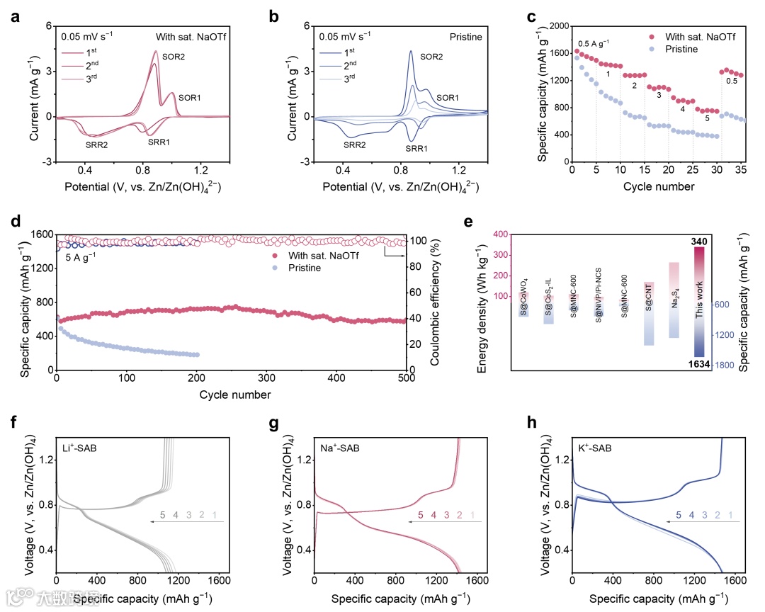 图4 电化学性能评估。(a,b)Na+-SAB的 CV 曲线、(c) 倍率性能和 (d) 循环性能;(e) 与其他 Na+-SAB 体系的能量密度比较;(f-h)Li+、Na +和K+-SAB体系优化后的前5次循环的恒电流放电/充电曲线。