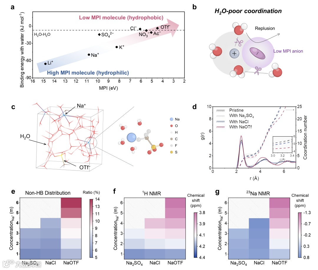 图2碱金属离子-贫H₂O配位结构的设计。(a) MPI 与离子和水分子之间的 ΔG 之间的关系。(b) 低 MPI 阴离子导致碱金属离子-贫H₂O配位结构的示意图。(c) NaOTf 电解质的 AIMD 模拟快照。(d) 不同添加剂电解质中 Na+ 的径向分布函数 g(r) 和相应的配位数。(e) 由拉曼光谱拟合的具有非氢键的水的比例,在具有不同添加剂的电解质中的(f) 1H NMR 和 (g) 23Na NMR 光谱。