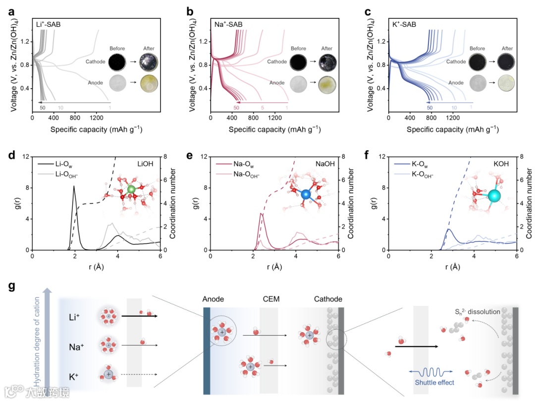 为深入理解这一现象,研究团队通过第一性原理分子动力学(AIMD)模拟揭示了碱金属离子与水分子之间的强相互作用。模拟结果显示,在3 mol/L的LiOH、NaOH和KOH溶液中,水分子与阳离子的平均距离分别为2 Å、2.4 Å和2.8 Å,表明水分子的配位结构与离子种类密切相关。这种紧密的水合结构导致水分子在循环过程中穿过隔膜,进而加剧了硫的溶解和穿梭效应,最终引发电池性能的快速衰减。