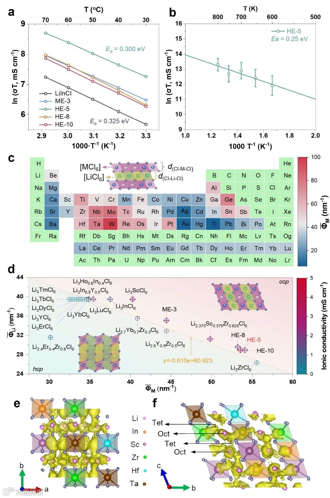 在不同的晶体结构中,金属离子电势的高低直接影响着固态电解质的离子导电率(图3d)。当材料为面心立方(ccp)堆垛结构时,由于[MCl₆]与[LiCl₆]八面体间的静电斥力增强,该结构通常能实现高于10⁻³ S cm⁻¹的室温导电率。相比之下,在较低离子电势下形成的六方密堆(hcp)结构,其导电率通常较低,仅约10⁻⁴ S cm⁻¹。在本研究中,我们合成的高熵和中等熵(ME)材料(ME-3、HE-5、HE-8和HE-10)均呈现出ccp结构,表明引入高价态、小半径金属有助于形成高离子电导结构。此外,为了保持电荷中和,Li⁺的含量相应减少,从而引入更多锂空位,并优化层间距比例,进一步促进离子迁移。由于堆垛结构在Li⁺迁移中起着关键作用,本研究提出了一种基于高熵策略的卤化物SSEs理性设计方法。