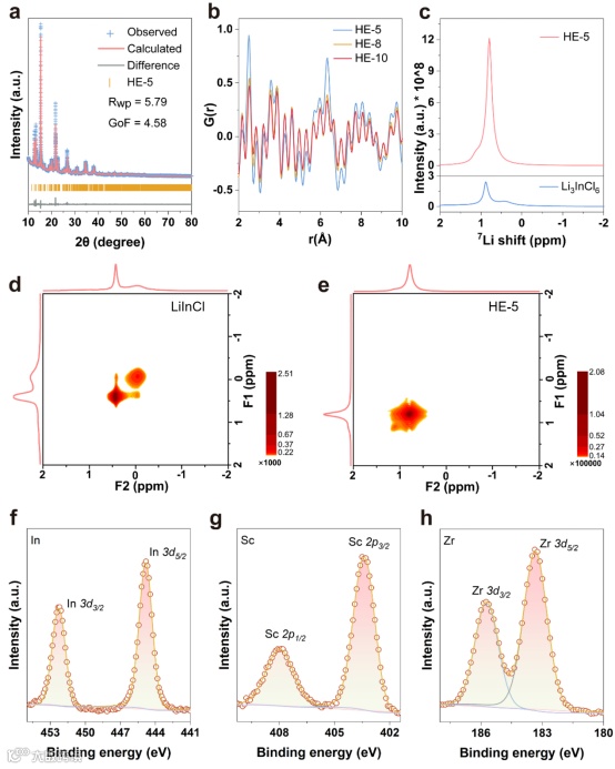 同时,X射线光电子能谱(XPS)结果(图4f-4h)进一步确认,在合成过程中未发生氧化还原反应,说明材料具有良好的化学稳定性,并成功实现了多种阳离子均匀掺杂。研究结果表明,高熵策略不仅可以增强晶格结构的稳定性,还显著提高了LiInCl框架对多种阳离子的固溶度。通过引入多种金属元素,高熵效应导致的局域晶格畸变促进了阳离子的均匀分布,同时优化了Li⁺迁移通道,为进一步开发高性能卤化物SSEs提供了新的思路和设计原则