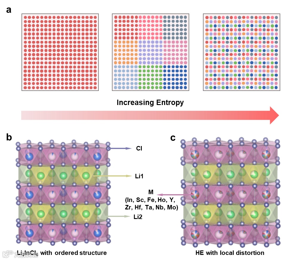 本研究采用高能球磨并结合固相反应工艺合成了高熵卤化物固态电解质,其中多种氯化物前驱体经过高能球磨,并在惰性气氛中热处理,形成稳定的高熵结构。图1表示,引入多种阳离子可提高结构熵、降低吉布斯自由能,在维持长程有序性的同时,局部晶格因离子半径和键合状态的差异产生显著畸变,导致短程无序化。相比于传统有序LiInCl结构,高熵电解质的无序晶格形成复杂的锂离子迁移通道,化学无序效应进一步破坏晶格均匀性,拓宽局部位点能量分布范围,从而促进相邻位点间的能量重叠并增强离子跃迁,以期实现更高的离子电导率和电化学稳定性。