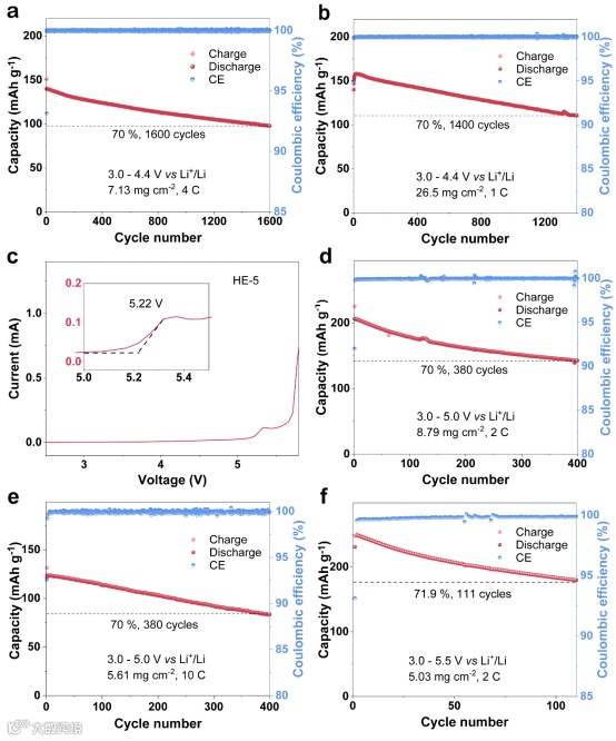 图5评估了HE-5固态电解质在全固态电池(ASSB)中的性能。电池在4C倍率下循环1600次后仍保持70%容量,库仑效率高达99.9%(图5a)。在高负载正极(26.5 mg cm⁻²)下,循环1400次后容量保持率仍达70%(图5b)。线性扫描伏安法(LSV)测量表明,HE-5的氧化起始电位高达5.22 V,远超Li₃InCl₆(4.20 V),展现出较高的高压稳定性(图5c)。在5V高压下,ASSB在2C倍率下可稳定循环380次(图5d),10C倍率下循环380次后仍保持70%容量(图5e)。进一步将充放电电压提高至5.5V,电池初始放电容量超过230 mAh g⁻¹,并在100次循环后保持稳定(图5f)。总体而言,HE-5凭借超高氧化稳定性、长循环寿命及优异的倍率性能,在高能量密度、高压快充全固态电池应用方面展现出巨大潜力。