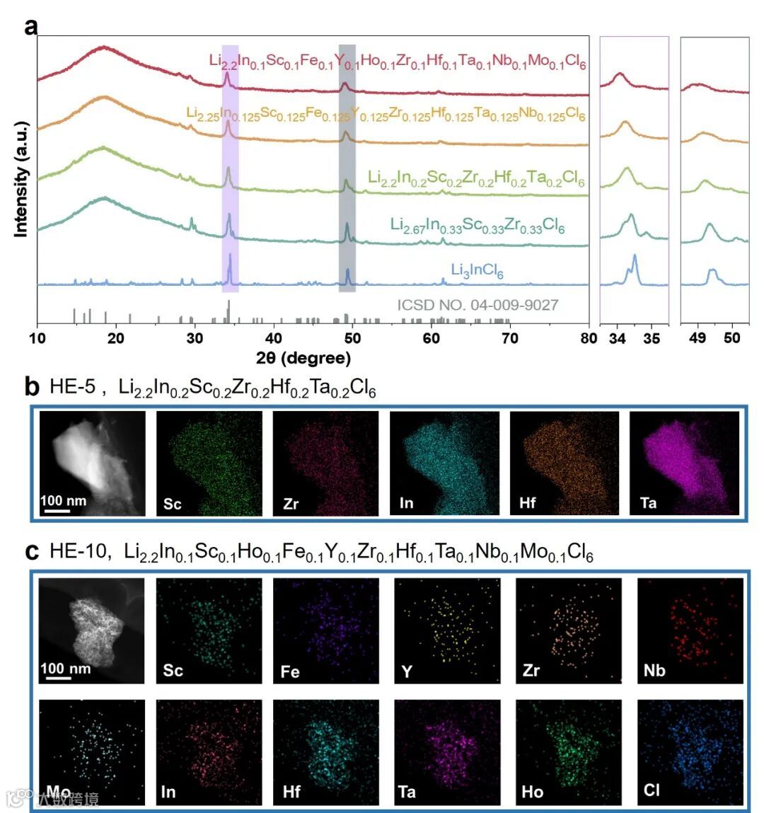 基于对高熵材料的基础理解,本研究深入探讨了卤化物电解质的复杂结构特性,如图2所示。合成的固态电解质(SSEs)经粉末X射线衍射(PXRD)表征后显示,随着熵配置的增加,其衍射峰明显展宽(图2a)。这一现象表明材料逐渐向熵稳定的无序相转变,这种无序化可能有助于提高离子迁移能力。与此同时,扫描透射电子显微镜(STEM)元素分布图进一步揭示了材料内部的元素均匀性,HE-5、HE-8和HE-10的组成元素均匀分布,证实了高熵SSEs的形成(图2b, 2c)