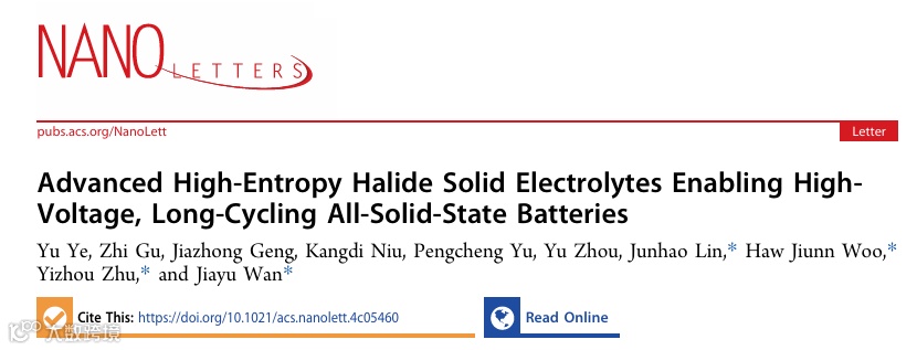 Ye, Y.; Gu, Z.; Geng, J.; Niu, K.; Yu, P.; Zhou, Y.; Lin, J.; Woo, H. J.; Zhu, Y.; Wan, J. Advanced High-Entropy Halide Solid Electrolytes Enabling High-Voltage, Long-Cycling All-Solid-State Batteries. Nano Lett. 2025, ASAP.