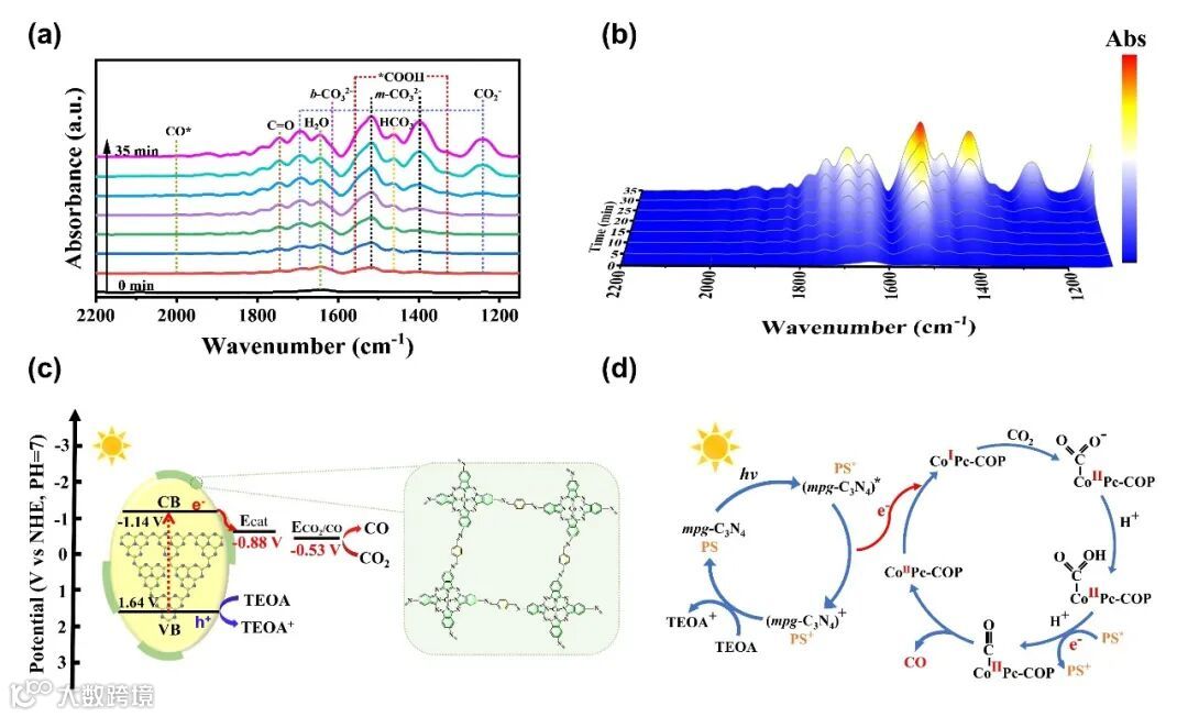 图5. CoPc-COP0.02@mpg-C3N4的光催化机理。(a-b)原位红外光谱;(c-d)光催化CO2还原机理示意图。