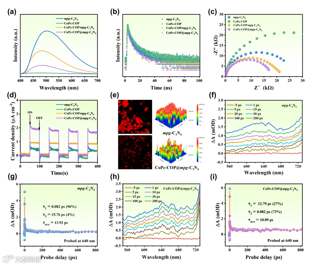 图4. 催化剂的光电测试。(a)荧光光谱;(b)瞬态荧光寿命光谱;(c)电化学阻抗谱图 ;(d)光电流响应谱图;(e)激光共聚焦图像;(f-i)瞬态吸收光谱及衰减动力学谱图。
