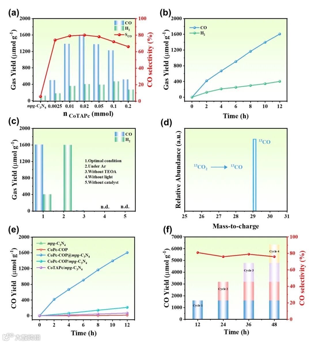 图3. CoPc-COPX@mpg-C3N4 的光催化CO2还原性能图。(a)不同CoPc-COP负载量复合光催化剂的CO2还原性能对比;(b)CoPc-COP0.02@mpg-C3N4随时间变化的气体析出量;(c)光催化剂对照实验;(d)13C同位素标记实验;(e)不同光催化剂的CO2还原性能对比;(f)光催化循环实验。