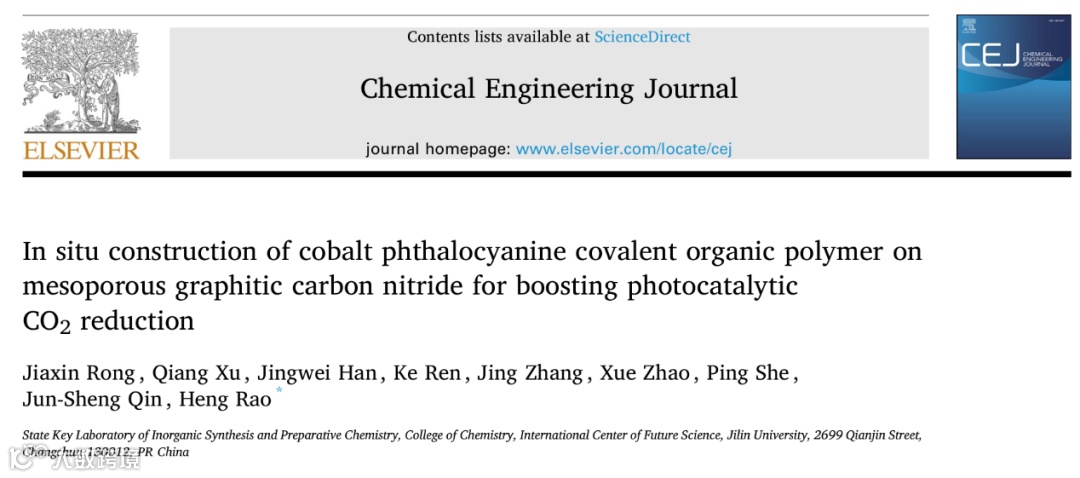 基于此,吉林大学饶衡团队,在期刊Chemical Engineering Journal上发表题为“In situ construction of cobalt phthalocyanine covalent organic polymer on mesoporous graphitic carbon nitride for boosting photocatalytic CO2 reduction”的文章。该研究通过四氨基钴酞菁(CoTAPc)与对苯二甲醛(TA)席夫碱反应,将钴酞菁共价有机聚合物(CoPc-COP)原位聚合在mpg-C3N4表面,成功制备了一种2D/2D复合光催化剂CoPc-COPX@mpg-C3N4。这种复合光催化剂中,CoPc-COP和mpg-C3N4之间通过π-π相互作用形成的界面增强了光生载流子的分离和转移效率。另外,由于钴酞菁单元的存在,光催化CO2 还原产物的选择性显著提高。在无贵金属光敏剂参与的光催化体系中,mpg-C3N4捕获可见光产生光生电子作为光敏剂,CoPc-COP中的钴酞菁单元接受光电子用于CO2还原作为活性中心,实现了光捕获和催化过程的时空分离。此外,作为一种非均相光催化剂,它具有易于回收、稳定性好、可循环使用等优点。这项工作为构建 2D/2D mpg-C3N4 基复合光催化剂以实现高效光催化 CO2 还原提供了一种新的思路。