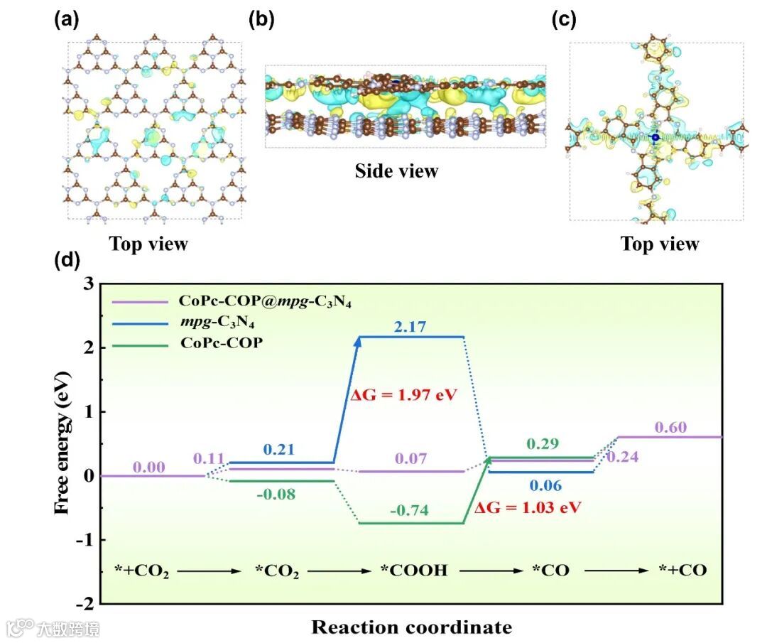 最后,通过直观的差分电荷密度证实了电子从mpg-C3N4一侧经过两者界面向CoPc-COP一侧迁移,实现了光生载流子的有效分离和转移。由DFT理论计算可知,CoPc-COP0.02@mpg-C3N4中*COOH形成的能垒(ΔG =−0.14 eV)远低于mpg-C3N4的*COOH形成能垒(ΔG = 1.97 eV)。另外,CoPc-COP0.02@mpg-C3N4中*CO形成的能垒(ΔG =0.22 eV)也远低于CoPc-COP中*CO形成能垒(ΔG = 1.03 eV)。以上结果表明,引入CoPc-COP有利于优化CO2还原反应的限速步骤,加速CO2还原动力学,从而提升了mpg-C3N4在CO2还原中的催化效率。