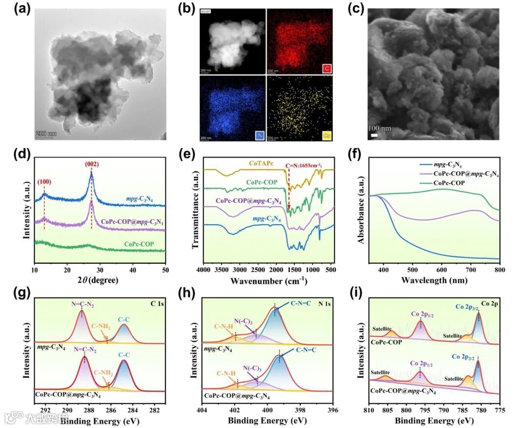 图2. CoPc-COPX@mpg-C3N4 的结构表征。(a)TEM 图像;(b)TEM-EDX 图像;(c)SEM 图像;(d)XRD图谱;(e)FT-IR 光谱;(f)UV-Vis DRS 光谱;(g)XPS谱图。