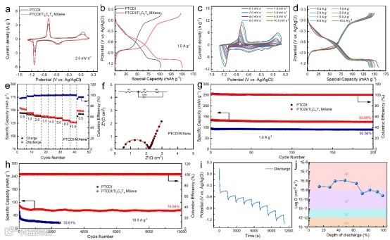 (a)PTCDI 和 PTCDI/MXene 在2.0 mV s-1时的CV曲线和(b)1.0 A g-1下的GCD曲线。(c)PTCDI/MXene在0.50 mV s-1至10.0 mV s-1时的CV曲线和(d)0.50 A g-1至 10.0 A g-1时的GCD 曲线,(e)PTCDI/MXene的倍率性能,(f)奈奎斯特图,(g)1.0 A g-1时的循环寿命,以及(h)10.0 A g-1时的循环寿命。(i)GITT 和(j)放电过程中相应的计算 K+扩散系数以及与其他离子的比较。