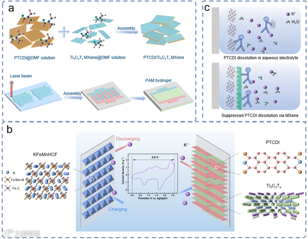 (a)水性钾离子微型电池的制造工艺和(b)结构和工作原理。(c)MXene 的引入减少了 PTCDI 电极的溶解。