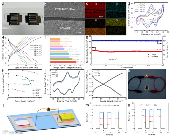 (a)叉指电极的照片。(b)叉指电极的SEM图像和(c)STEM 映射图像。(d)1.0 至 5.0 mV s-1 的 CV 曲线。(e)0.50 至 5.0 mA cm-2 的 GCD 曲线。(f)AMB的平均电压平台比较。(g)APIMBs 的循环寿命和库仑效率。(h)能量和功率密度图。(i)不同弯曲程度下的 CV 曲线和 (j)GCD 曲线。(k)由单个APIMB 驱动的 LED 灯泡。(l)集成APIMBs-PS系统示意图。(m)在重复压缩释放循环中,不同应力条件下APIMBs驱动的 PS 电流与时间的关系。(n)在相同应力条件下,由单个APIMB驱动的 PS 的电流与时间之间的关系。