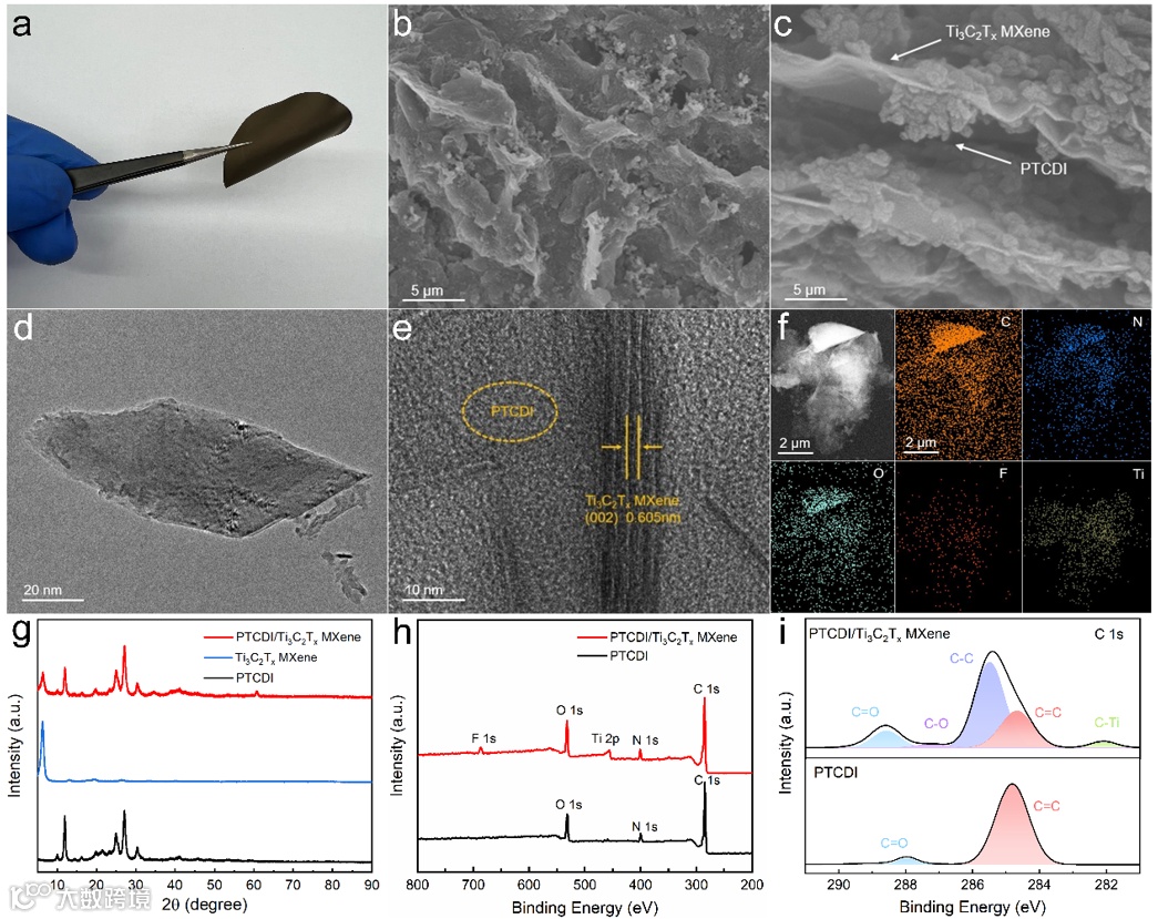 (a)光学照片,(b)表面的SEM图像和 (c) 横截面,(d)TEM图像,(e)PTCDI/MXene 的HRTEM图像,(f)STEM映射图像。(g,h,i)XRD、XPS全光谱和C1s精细光谱。