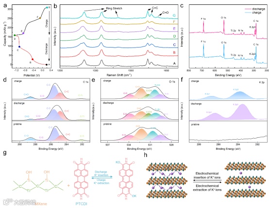 (a)PTCDI/MXene负极的典型充放电曲线,其中字母表示采样点。(b)在每条曲线所示的选定电位下PTCDI/MXene电极的拉曼光谱。(c)充放电过程中PTCDI/MXene的XPS全光谱。(d)PTCDI/MXene在原始、放电和充电过程中的高分辨率XPS能谱,包括C 1s、(e)O 1s和(f)K 2p。(g)钾离子电池充放电过程中的双电子氧化还原机理。(h)内部离子传输图。